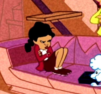 This is a model photo of a character from the Onlyfans platform. The character appears to be a young girl or woman with a concerned or contemplative expression, sitting on a couch-like structure. She has dark hair and is wearing a red top with white lining. Her posture suggests she might be deep in thought or reacting to something happening offscreen. The image is vibrant and colorful, typical of animated media.