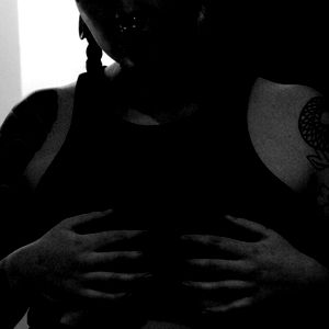 This is a black and white photo of a person standing with their arms crossed. The individual appears to be wearing a tank top and has visible tattoos. Their expression is neutral, and they are looking directly at the camera.