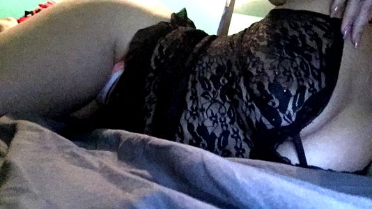 Model xoxobabygirl, wearing black lace lingerie and lying on a bed, is captured in this enticing photo. Her seductive pose suggests a playful and alluring atmosphere. The image also subtly includes elements of the bedroom setting, adding to its sensual ambiance.