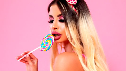 Sexy model in a playful pose with a sweet treat, striking a pose for OnlyFans