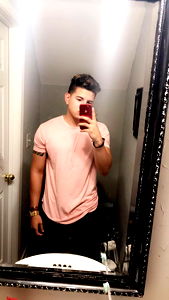 A photograph of OnlyFans model Ronnie V, seen in a mirror image with his face obscured by the reflection. He is wearing a pink t-shirt and appears to be in a bathroom setting. The model has a tattoo on his right arm.