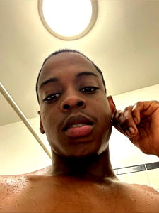 In this image, Kilo S demonstrates a unique perspective on using a shower head, with a focus on personal grooming. He is captured in the midst of an action shot, adding a dynamic element to the scene.
