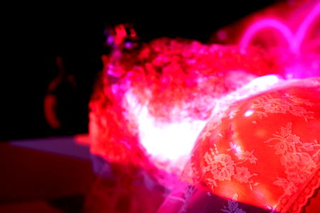 The image shows a person taking part in a photoshoot, captured from a low angle. They are wearing a bikini and appear to be mid-motion or striking a pose. The focus is on the upper body with one arm raised, and the background is nondescript with red and blue lighting effects.