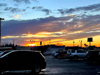 A serene evening scene with the warm glow of a sunset over a cityscape. The sky is painted in hues of orange and pink, casting long shadows and creating an atmosphere of tranquility.