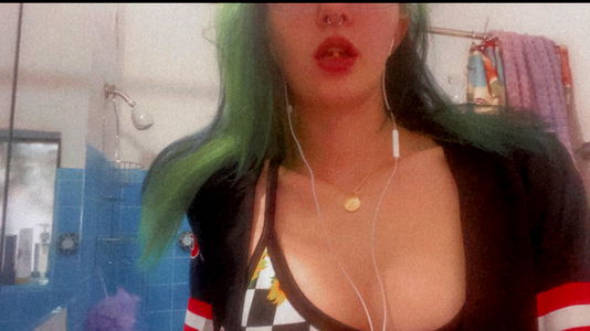 In this image, we see a model named Tris posing for the camera. The model is an adult female with teal hair and is wearing a black and white top. She is also seen holding earphones in her hand. The background suggests that she might be indoors near a bathroom or a shower area.