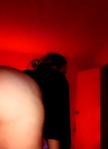 In this image, the model Babybluee is seen posing provocatively. She's standing against a wooden wall and wearing a black and white outfit that leaves much to the imagination. Her pose suggests she's enjoying herself, with her tongue playfully sticking out. The setting seems intimate and private.