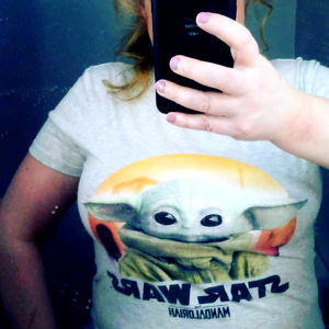 In the image, you can see a person taking a selfie with their phone. They are wearing a t-shirt featuring a humorous cartoon character and the text 'Star Wars', which adds a playful touch to the overall outfit. The person appears to be standing indoors, possibly in a casual setting.