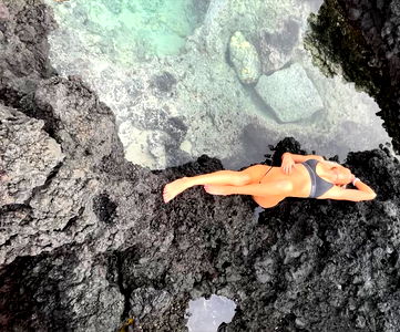 An OnlyFans model, known as 'baby girl xx', is captured in a stunning outdoor setting, resting on rocks with lush greenery. She sports a black bikini and appears to be enjoying some downtime amidst nature's serenity.