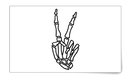 A black and white illustration of a skeleton hand giving the peace sign, set against a white background.