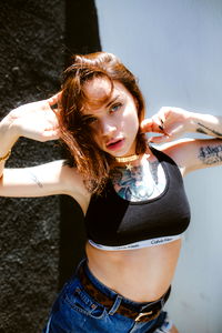Striking portrait of a young woman posing for Onlyfans. She's looking off to the side, exuding confidence and beauty.