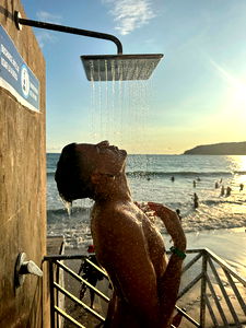 A shirtless man enjoying a shower under the open sky at the beach, with the sunset casting a warm glow. His hair is slicked back from the water and he is looking to his right.
