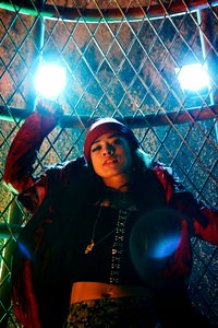 The image features a model posing in front of metal bars, exuding an air of urban chic. The model is dressed in a stylish outfit and sports a confident pose.