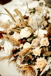 This image showcases a charming bouquet of flowers, elegantly arranged with dried flowers. The bouquet is set against a rustic background, creating a picturesque scene. It's a perfect centerpiece for any vintage-themed wedding, exuding an air of romance and timeless beauty.