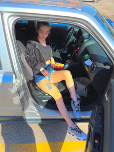 The model, Babydiamond19 from Omaha Nebraska, is captured in a relaxed posture, with her hair casually done up. She has a youthful and energetic vibe. Her attire and the car's interior suggest an urban setting.