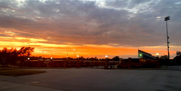 A serene scene of a sunset overlooking a parking lot, with a park in the background. The colors of the sky range from vibrant oranges to deep blues.