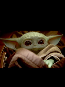 A humorous image of the Mandalorian's baby, Grogu, in a cute pose, with YozF holding him. Fans of the series are drawn to the adorable scene.
