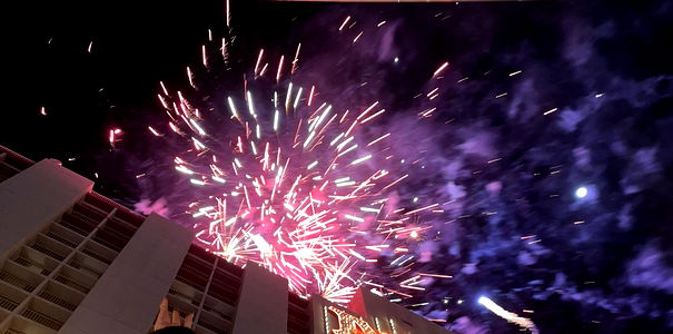 Model B.Ae striking a pose by the window with a view of a casino. Shot in color, she captures a moment of elegance and style.