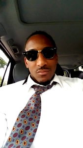 The image is of a person in sunglasses, wearing a tie and a white shirt, seated inside a vehicle. The individual appears to be dressed in semi-formal attire with an accessory that suggests a professional or stylish theme.