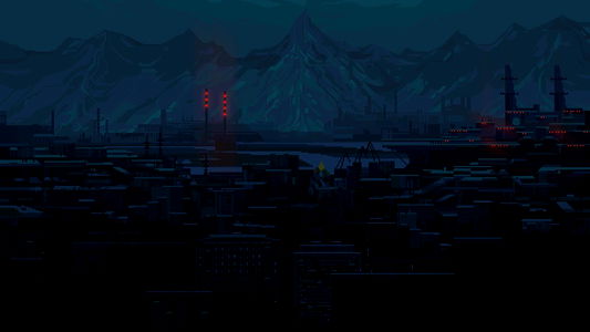 A captivating digital illustration of a city at night, surrounded by rugged mountains. The scene is filled with industrial buildings, illuminated by the glow of numerous lights. A deep blue sky blankets the landscape, creating a stark contrast with the urban structures.