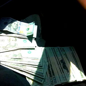 The image shows a car interior with a significant amount of US dollars, prominently a $20 bill and several $100 bills. The money is laid out on what appears to be the car's center console area. The focus of the photo seems to be on the money and its arrangement, rather than the vehicle itself or any other objects.