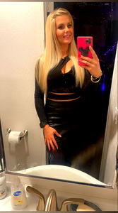 The image shows an OnlyFans model posing confidently in a bathroom mirror. She is wearing a chic black and gold dress, her blonde hair styled to perfection, and her nails painted a vibrant shade of red. The bathroom has a modern touch with its sleek design. The model's pose suggests she is comfortable and proud of her appearance. This photo could be used for modeling portfolios or as promotional material for the OnlyFans platform.
