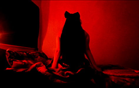 Barbiemasacre captures the essence of an evening at home, her moody expression adding a layer of complexity to this candid shot. She's dressed casually in a simple shirt and pants, her posture relaxed yet introspective.