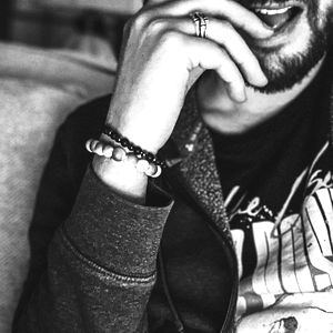 In this image, Mr. Rachel, a 32-year-old individual, is captured in a moment of contemplation. He's comfortably seated on a couch, his hand resting thoughtfully on his chin, suggesting deep concentration or analysis. His attire consists of a casual gray hoodie and a laid-back hairstyle. On his wrist, you can spot a subtle bracelet, adding to the relaxed vibe of the scene.