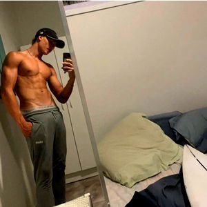 A photograph of the model Bayley, captured from a mirror reflection in a bathroom. The image captures his muscular physique and showcases him in a candid moment.