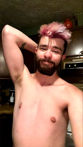 A proud OnlyFans creator in a pink mohawk and purple hair, capturing his essence as he smiles for the camera.