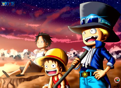 This is a stylized piece of artwork inspired by the anime series One Piece. The character, Monkey D. Luffy, is depicted in his signature straw hat alongside two other characters from the series. They are shown in an exaggerated pose against a backdrop reminiscent of a desert sunset, with a starry sky above them. The artwork captures the essence of adventure and friendship central to the One Piece narrative.