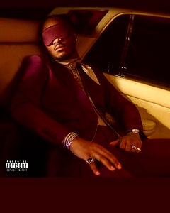 Vibrant album cover featuring a man in an eye mask, purple suit with sunglasses, lying on back seat of car. The background is blurred but suggests a nighttime setting.