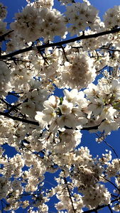 A captivating view of cherry blossom trees in full bloom, their delicate white petals contrasting with the clear blue sky. The branches sway gently, showcasing the tree's abundant bloom. A serene and picturesque scene, perfect for springtime.