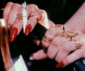 A close-up image of a model named Louloulee, showcasing her nail art featuring red nails and various accessories. The model is also wearing a ring in one hand, which adds to the overall fashionable vibe of the image. This photo could be used for social media posts about beauty, fashion or lifestyle.
