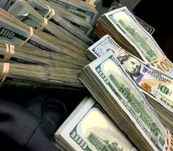 A photograph captures a young adult in a bathroom setting, holding a stack of US currency over their head. The individual is shirtless and appears to be posing for the camera with a confident expression. A smartphone is visible in the background, displaying an array of colorful stickers on its case. The scene suggests a context of financial management or social media marketing.