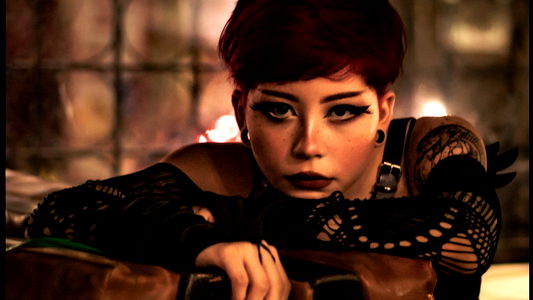 This is an exquisite portrait photograph of a young woman, estimated to be around 22 years old. She possesses striking features that are accentuated by her radiant skin. The woman's face is the focal point of the image, a human face that scores very high on the recognition scale. Her gaze is entrancing, framed by well-defined eyebrows and long, fluttery eyelashes that add a touch of drama to her look. Her hair, dyed a vibrant shade of red, is styled with bangs, adding a youthful touch to her appearance. The red hair color truly stands out, enhancing her overall allure. Her hairstyle is trendy, with the bangs perfectly complementing her face shape. She is wearing lipstick that accentuates her lips, well defined and adding a pop of color to her face. It appears she might be wearing wings, perhaps as part of a costume or a fashion statement. This element adds a unique, fantastical aspect to the portrait. Overall, this photograph captures the essence of a young, stylish woman with a bold sense of fashion, resulting in a portrait that is both captivating and memorable.
