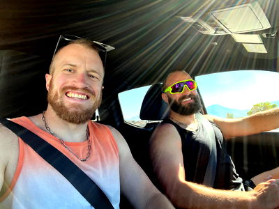 Two friends enjoying the outdoors in a scenic location. They are both wearing hats, shades and sunglasses, indicating sunny weather. One friend is sporting a beard and mustache, while the other sports a more trimmed look. Both are smiling, suggesting they are having a great time together.