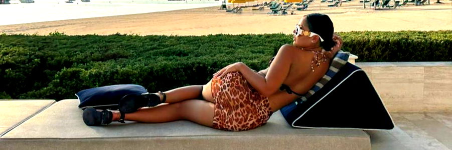 A sizzling OnlyFans model, Beatrix Blu, takes her pink floatie for a spin in the pool. Her beachwear and sunglasses add to the summer vibe.
