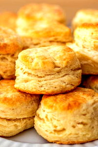The image displays a delightful assortment of golden brown biscuits stacked on top of each other on a table. Their flaky texture suggests they are freshly baked and ready to serve.