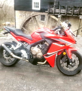 A photograph of a motorcyclist, seemingly posed for the camera. He is wearing casual attire and has his hand on his hip.