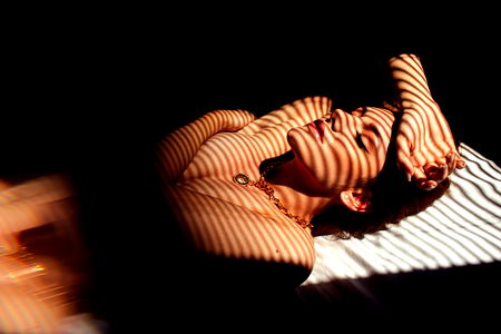This is a highly detailed image of a woman engaging in a professional indoor photo shoot. The focus of the image is the woman, who is possibly a model or art model. She is dressed in an outfit that reveals her chest, stomach, and abdomen, highlighting the contours and details of her figure. The clothing she is wearing is a crucial part of the image, contributing to its aesthetic appeal. The woman's face is also prominently featured in the image, with the photographer capturing the nuances of her facial expressions. Her countenance exudes a mix of poise and intensity, fitting for the setting of a professional photo shoot. The woman's location within the image is also worth noting. She is positioned against a wall, which provides a neutral backdrop that further emphasizes her as the focal point of the photo. Furthermore, there is a bed present in the scene, subtly hinting at a private or intimate setting. This element of the image adds a layer of complexity to the overall narrative of the photo. Despite the simplicity of the setting, the image has a rich and varied composition, with each element playing a role in creating a compelling visual narrative.