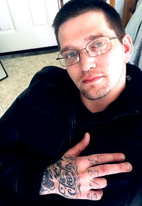 Eric is a young adult man with tattoos, sitting and posing in a room. He's holding his hand near his heart and has glasses on. His outfit consists of a black jacket and he appears relaxed in the image.