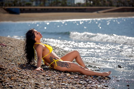 Beautiful Belinda is seen walking along the sandy shoreline. She's wearing a vibrant bikini that accentuates her stunning physique. The beach setting suggests a relaxing and fun day out in nature.