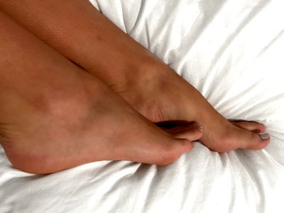 Freshly pedicured toes of OnlyFans model Bella Grace. The model is captured resting on a white comforter, with well-maintained nails reflecting the soft light.