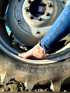 A photo of a person with one foot resting on the spokes of a tire, possibly from the OnlyFans account Bellafeetgun. The model is standing in front of a vehicle with a tractor wheel and appears to be showcasing their foot.