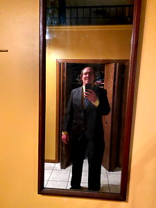 A man standing in front of a Rochester Diner. He is wearing glasses and a beard, dressed casually with a t-shirt.