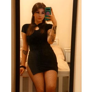 In the image, Beth is seen posing confidently for a selfie. She is wearing a black top and fishnet stockings, exuding a casual yet chic vibe. Her pose against the mirror reflects her relaxed and approachable personality.