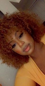 An individual with voluminous curls in a yellow top, wearing makeup and sitting against a wall. OnlyFans model name is 'honey ๐ฏ'.