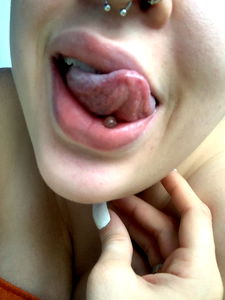 A close-up of an OnlyFans model with a pierced tongue. The model appears to be in mid-speech, capturing a candid and engaging moment.