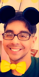 A person wearing glasses and a yellow bow tie, posing with a cheerful expression in front of a restaurant or bakery. The individual has short hair and appears to be enjoying the moment.