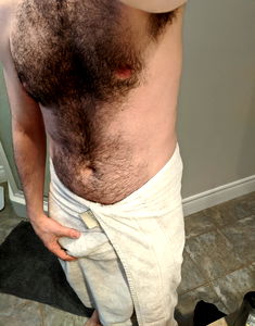 Adult content warning. Explicit image with visible nudity. Image depicts a man from Canada, known as Bigam56 on OnlyFans. He has a well-groomed beard and is shirtless. His age appears to be in his 30s or 40s.